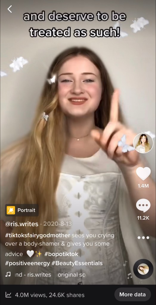 I write and share articles here on subjects such as body image, the body positivity movement, and mental health, but I also create videos performing my original poetry as a character called Fairy Godmother on social media.